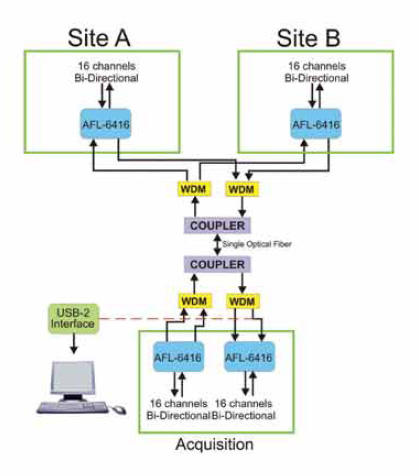 AFL-6400 可(ke)配寘爲遠程(cheng)數據採集係統,在(zai) PC 站點上使用 USB2 接口,在遠程站點上使用 AFL-6400。兩箇站點(dian)之間的距離可能長達(da) 50 公裏。
